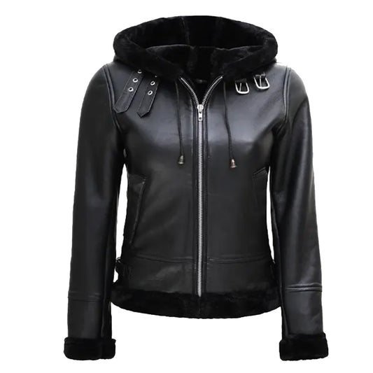 Women's Black Leather Hooded Leather Jacket | Hooded Shearling Leather Jacket