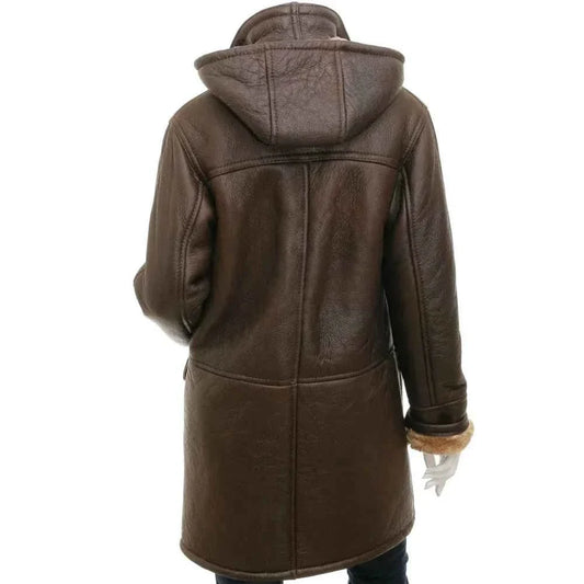 Women's Brown Sheepskin Duffle Coat With Hood | Leather Jacket Coat
